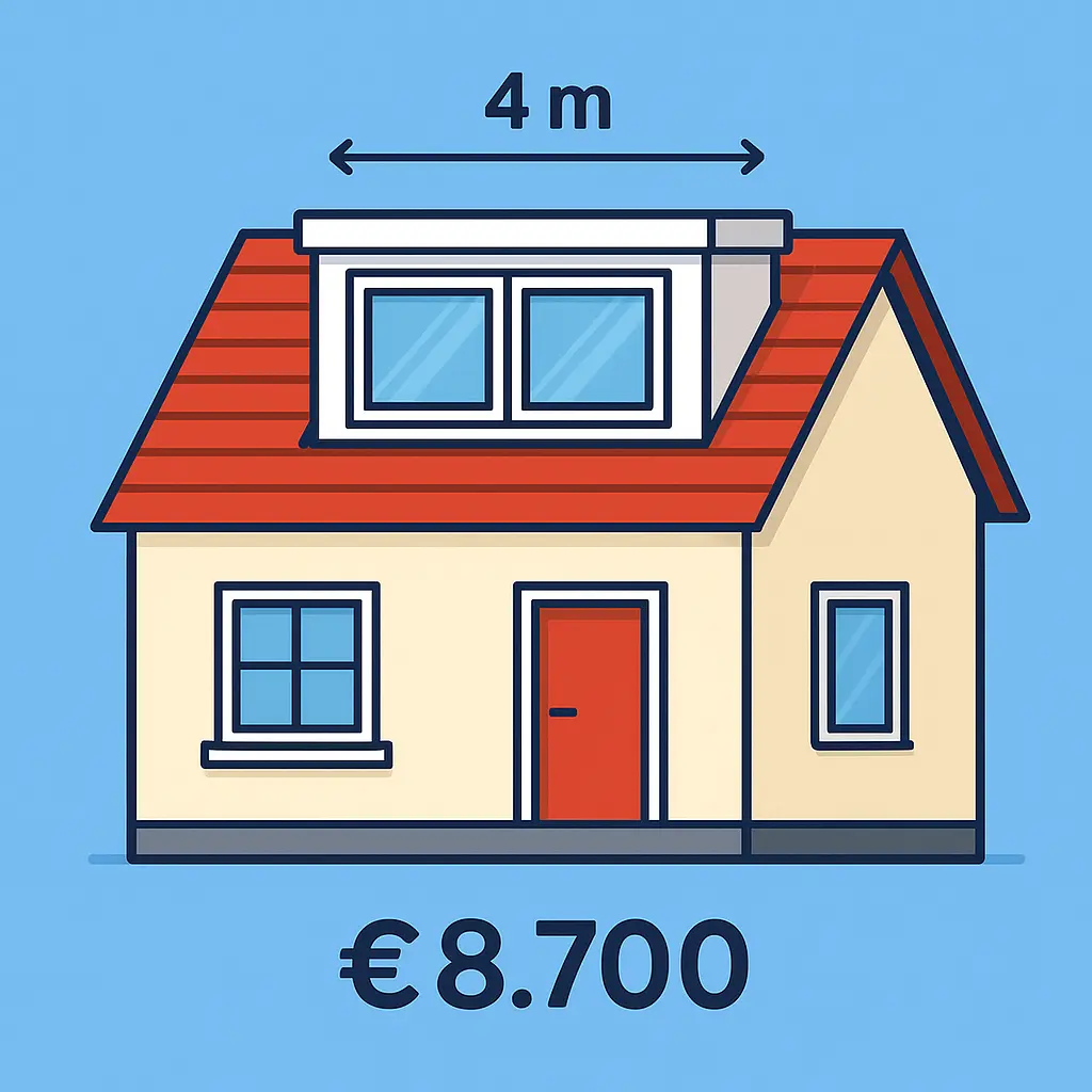 De kosten van een dakkapel van 4 meter inclusief montage vallen vaak in het middensegment. Dit formaat is groot genoeg voor een volwaardige kamer, maar blijft betaalbaar. In 2025 betaal je voor een prefab kunststof dakkapel gemiddeld tussen de € 7.200 en € 8.000. Houten modellen kosten meestal € 8.500 tot € 9.500. Kies je voor een luxe afwerking met draaikiepramen, rolluiken of knieschotten, dan stijgt de prijs richting de € 10.000. Veel mensen kiezen voor dit formaat omdat het een goede balans biedt tussen ruimtewinst en investering.